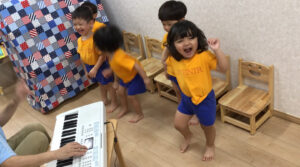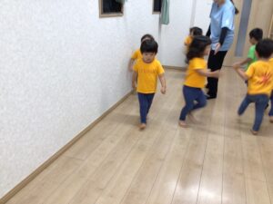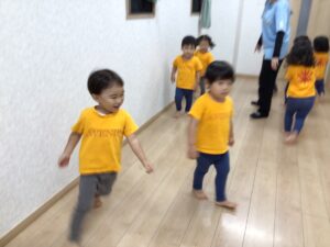 最近はピアノの音に合わせての動きも加わりました。遅い曲の時はゆっくり、ふつうの時には行進、速い曲では小走りをします。途中で急に変わるので耳でよく聞きながら動きを変えます。みんな速い動きが大好きで高速で高音の「ぶんぶんぶん」になると元気よくチョコチョコチョコっと足を運びます。
