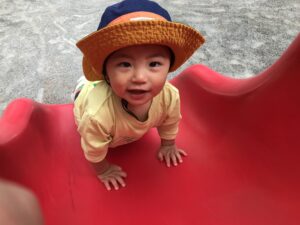 ダイナミックに降園でハイハイしたり、ベンチでつかまり立ちをしたり、楽しく過ごしています。