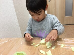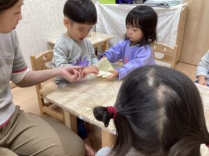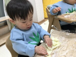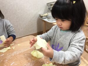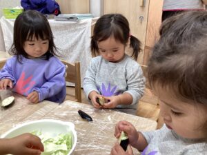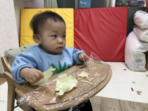 今回の食育のテーマは「みんなで作ろう!」なので、子どもたちに食べる食材を紹介し、自分たちでちぎってもらったり、割いてもらったりしました👍