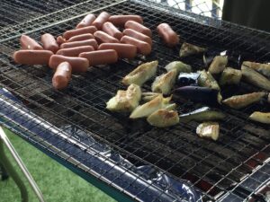今回のイベントでは、普段の給食では使用しない国産の牛肉やウインナーを用意し、少し大きめに切って、普段の給食では目にすることのない、炭を使った火や、専用の用具を見て、さまざまな物の扱いを知ったり、お肉や野菜に触れ、焼く工程を目の当たりにし存在感のある状態を見てもらいました✨