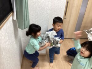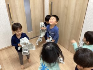 いつもなら、「モノは投げないよ」と言われているにじ組さんは「え?いいの?」と言うようなお顔をして、ここぞとばかりに上へ投げてみたり、遠くに飛ばしてみたりとても嬉しそうでした😆