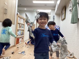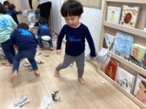 転ばないように、お友だちとぶつからないように、声掛けはしていましたが、子どもたち自身が楽しくもお友だちとケンカせず、少しぶつかっても楽しさが勝ち、ニコニコと「一緒にやろ〜」と言った声まで聞こえ、色々な成長が見える時間でした!