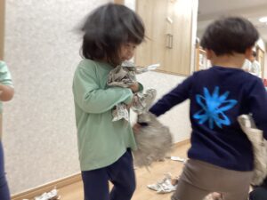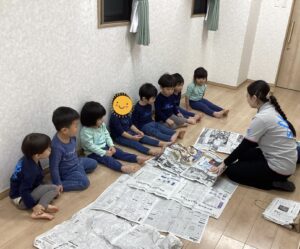 大きな大きな新聞紙📰をたくさん広げて、一枚ずつ配りました。