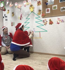 昨日は午前中は、催しや、お給食、おやつにクリスマスメニューをいただいて、またクリスマスのお衣装を着て散歩にも出かけ、夕方にはサンタクロースさんとトナカイさんがきてくれてプレゼントをいただいて楽しい一日を過ごしました。