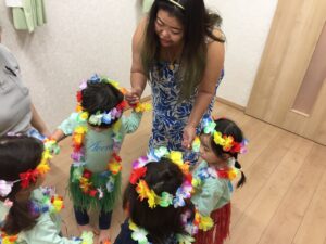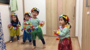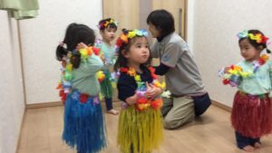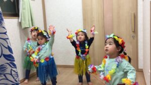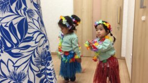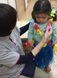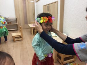 12月のフラダンスでは初めての衣装を着てみたそら組さんですが、今回とても可愛いらしかったのが、「レイをつける」と言って自ら衣装を身につけようとお話ししてくれたことです😊