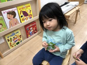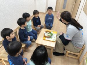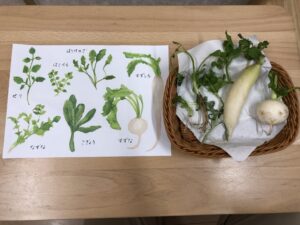 「すずしろ、すずな、ごぎょう、ほとけのざ、はこべら、せり、なずな」を用意して、一つ一つの葉っぱの違いなど、手にとって見て触ってもらいました。自分から匂いを嗅いでいるお友だちもいました。不思議ようにしていましたが、小さい大根やカブは認識しているので、嬉しそうに何度も触っていました😆
