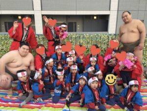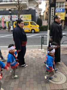 子どもたちは、お相撲さんと手を繋いで歩いたのがとても嬉しかったようで、緊張しておりましたが、保育園に帰ってくると「お相撲さんと手を繋いだんだー」と嬉しそうに目をキラキラさせていました!!
