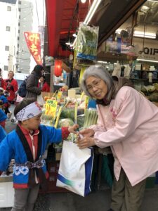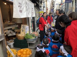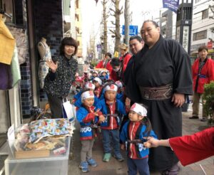 昨年もお世話になった近隣のお店屋さんに、遅くなりましたが新年のご挨拶として、餅つき大会のお餅を、お相撲さん、そして子ども達と一緒にお持ちしました。