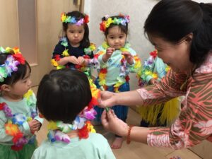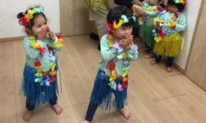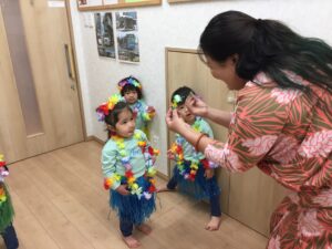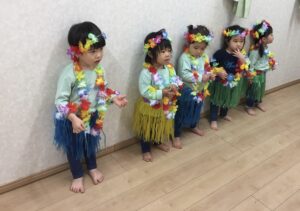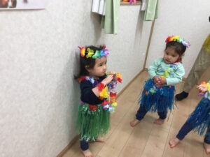 2月13日に行われたフラダンス、そら組子どもたちは登園後、室内に準備されたフラの衣装を見ると、嬉しそうな表情を見せてくれました。月一回で行われるフラのレッスンの日は、歓声で始まります😊