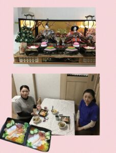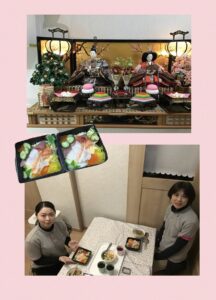この一年、子どもたちも、また職員も健康で過ごせるようにと、本部から『ひな祭りのお弁当』を用意して頂きました。お寿司のお弁当です。お弁当を囲んでお食事をいただきました。