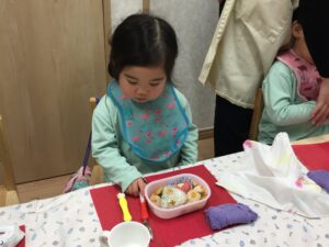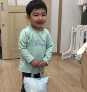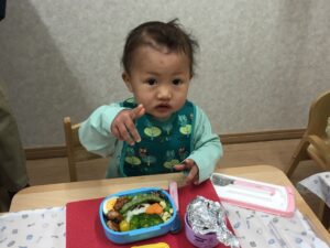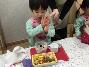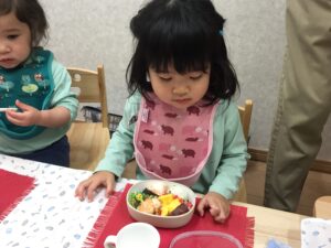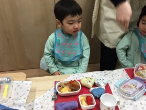 3月6日は、子どもたちにとって、とても嬉しい「お弁当DAY」でした。登園直後、ピクニックに出かけるような雰囲気で、お弁当袋を保育者に手渡してくれました♪