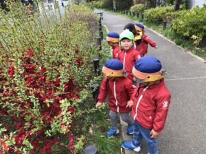 「鳥山川緑道」を通り、緑道沿いに咲いているお花を「こっちの赤いお花があっちにもあるよ」「このお花何て言うの」など、春の自然を満喫しながら、たくさんお話しもしながら歩きました。