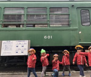 また、宮の坂に着くと、世田谷線の旧電車の模型が置いてあり、その中に入ることが出来ました。普段触れない運転席に一目散に行き、順番にたくさん触り、満喫しました!!