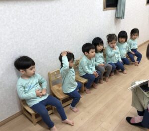 「にじ組さんはお散歩に出かけています!今度の4月からはそら組がにじ組にります。」と保育者が伝えると、少し首をかしげながら、その意味を一生懸命に受け止めようとしていました。