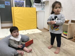少し涙がでましたが、初日から色々な音の鳴るおもちゃを触ったり、お部屋をハイハイで探検したり、朝寝もできたり・・・1日目とは思えないほどでした。