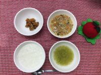 9月1日(月) お粥 鶏肉味噌煮(玉ねぎ、チンゲンサイ、コーン入り) ナスと人参さっぱりサラダ キャベツごぼう刻みスープ   9月2日(火) お粥 大根、人参、じゃがいも刻...