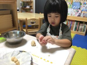 クッキングでクッキーを形成する時に、「What kind of shape do you want to make? How many triangle cookies are there? Can you count them?」など数や図形に関する質問に答えてもらいながら作業に取り組んでいます。