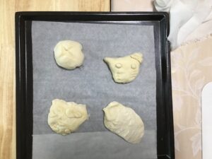 私も、キティちゃんもどきや、なんちゃってアンパンマンを作って、天板に載せると、とても喜んで焼き上がりを楽しみにして、焼き上がったパンを見るのですが、パン屋さんのようにはいかなくて、さらに似ていない状態になって、みんなで大笑いしています。