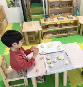 以前お友達と一緒に、加法に取り組んだので、土曜日のアフターコースで、パン作りをしている時に、そのビーズがお友達の目に入りました。