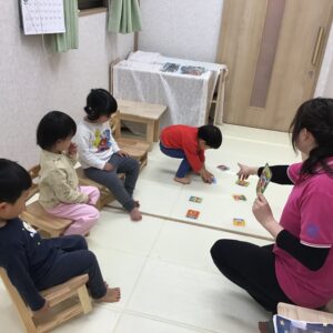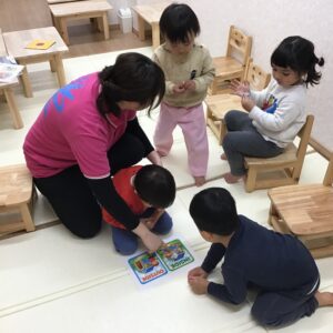 「導入」➡️動きのあるリズム🎵遊びと、落ち着いて楽しむカードゲームを組み合わせました。体の部分が書かれたカードを床に並べ、「headはどこ」、「Knees はどこ」と先生が聞くと、子どもたちが前に出てカードを探します。「これ!」を見つけたときの嬉しそうな表情がとても印象でした。