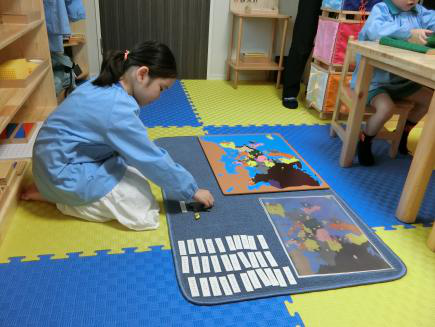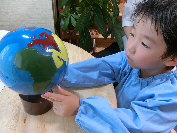 文化教育には、生物、歴史、地理、美術、音楽等が含まれます。子どもたちの興味に合わせたテーマ別活動で選択することができ、活動の中では、白と青の地球儀、花や木の絵合わせカード、図鑑、絵本等、様々な教具を用いて好奇心を刺激し、探求心へと繋げていきます。