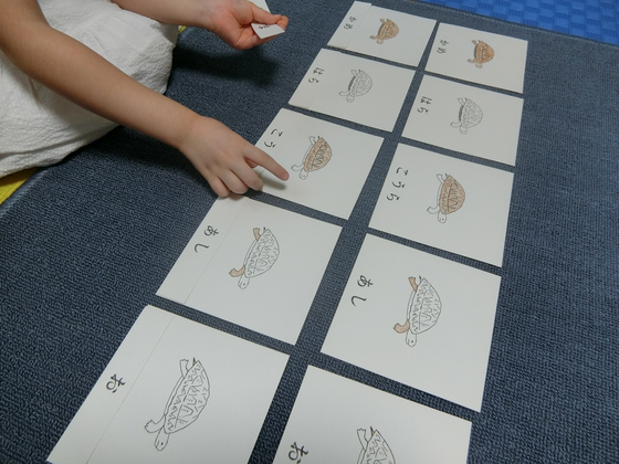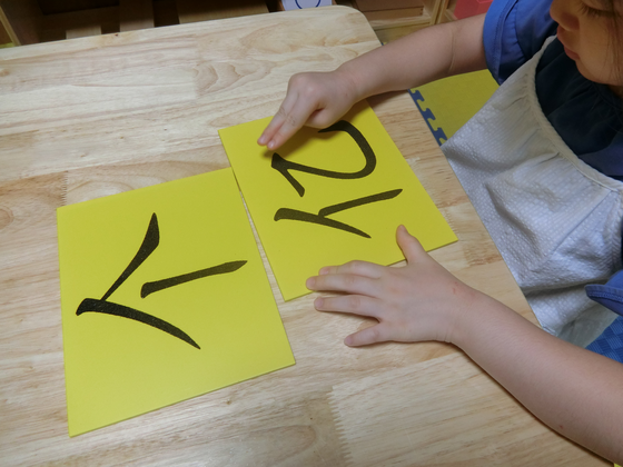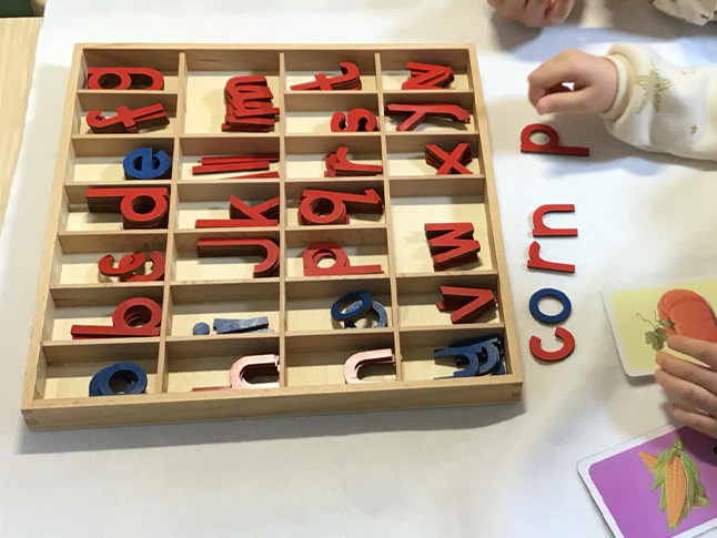 言語教育は、0歳~3歳までの間に家族や保育者の言葉や表情、絵本等の外界のありとあらゆる物を見聞きする中で、様々な言語を音と図で少しずつ認識していきます。1歳で10語獲得すると言われる語彙は、言葉の爆発期である3歳を迎える頃には、1000語を超えるとされ、聞く、話すだけだった言語の発達は、書く、読む事へと派生していきます。更に、そこから6歳にかけての言語の発達は著しい敏感期を迎え、獲得語彙数は約2500語となります。