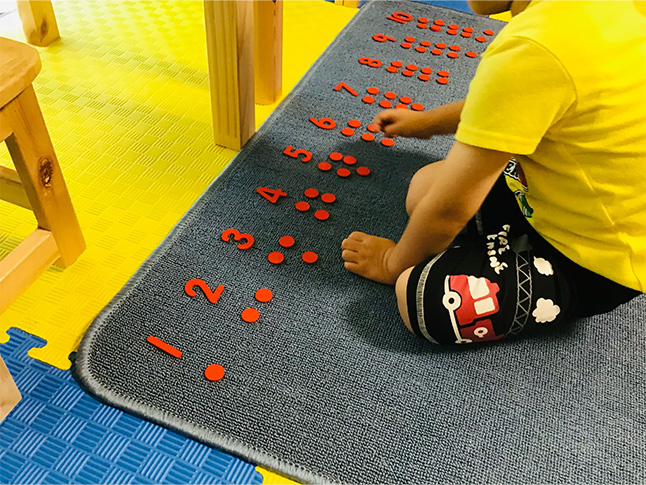 子どもたちの生活の中にも、数との関りは多く存在します。時間、長さ、重さ、物の数、年齢、回数等。考える力の基礎として、まずは数を唱える「数唱」から始まり、「数量」「数字」と一致させていきます。それは、モンテッソーリの教具に加え、そろばんを使うことで、数の認識を深め、数学脳を育みます。自信・集中力・注意力・忍耐力・記憶力・情報処理力を養い、情報処理をする右脳教育をモンテッソーリ教具(数える、並べる、十進法、四則演算方法数式の解、暗算)から始め、脳の活性化に伴い、脳機能を高めたり脳の構造を良い方向に変えたりする学習の土台作りを行なっていきます。