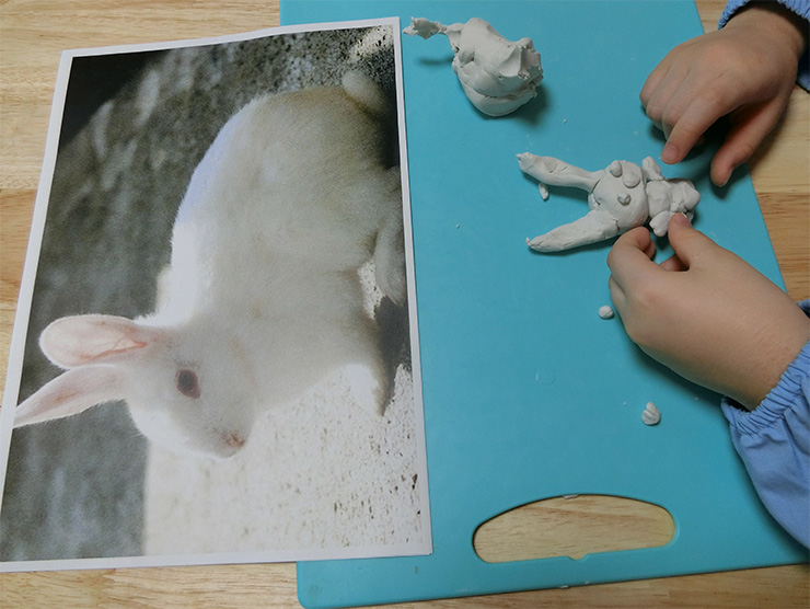 見たままを描く「模写」や、建物などの風景を描くときに用いる「一点透視図」等の絵画表現方法を学び、知る事で、自身のイメージをアウトプットさせる表現力を身につけていきます。平面構成を繰り返すことで立体への認識を深め、子どもの持つ表現の可能性を広げていきます。立体物(粘土、彫刻、異素材の組み立て等)の造形は、手先の機能が発達途中の子どもにとっては難しく、小さな挑戦の繰り返しとなりますが、子どもに内在する自身のイメージと、自分で手掛ける創作物との擦り合わせは納得のいく完成まで繰り返す事で、1つの目標に集中して行動ができている心理状態である「フロー状態」を作ることができます。フロー状態に入れば、圧倒的なパフォーマンスと楽しさを体験できると言われており、それは様々な学習の場面やスポーツ等、集中が必要な場面において発揮される事が考えられ、子ども達を自信へと導きます。