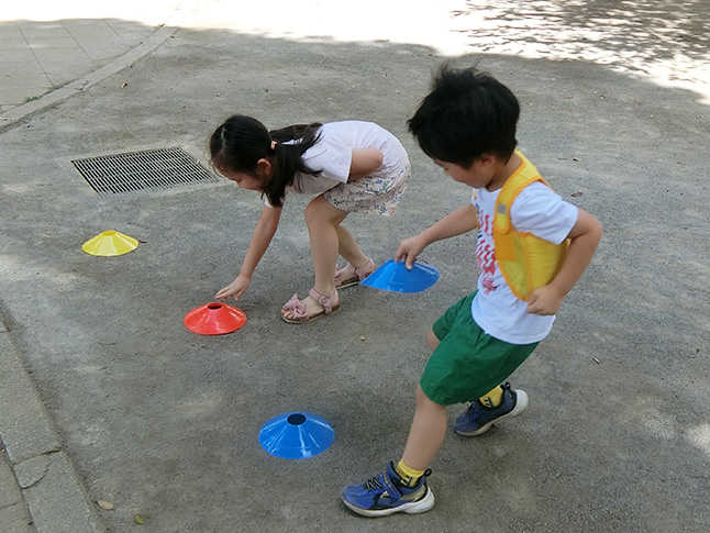 運動発達と知能発達は比例すると言われている中で、全身を使った粗大運動は大切になっていきます。音やリズムに合わせて自分の身体をコントロールできる力を養い、運動不足からの体力・発達を促す為に、存分に身体を動かせる戸外での運動活動、瞬発力と持久力を高めるサーキットトレーニングを取り入れ、強い体作りを行っていきます。