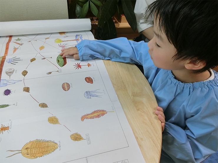 今過ごしている時間から、様々な物事の成り立ちの歴史や星、宇宙といった幅広い時間軸へと広がるその手掛かりを、図鑑や絵本、様々な教具を用いて学びます。更に、目で見るだけに留めず、国旗の色塗りや、地形、地球の造形活動を通して、手に取って感じ取る力と探求心を育みます。